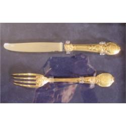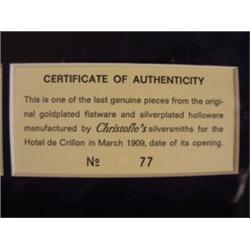 Christofle Hotel flatware framed in gold shadowbox. Two pieces. 8" dinner knife and a 7-1/4" dinner fork. Certificate of authenticity #77 identifies pieces as "original gold plated flatware"… manufactured by Christofle's Silversmiths for the Hotel de Crillon in Mar. 1909." Condition: Excellent