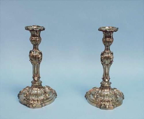 CHRISTOFLE, Paris - A pair of antique French silver plated bronze candle sticks. Each cast with relief flowers and scrolls. Fully marked. 11" high. 4800-5500