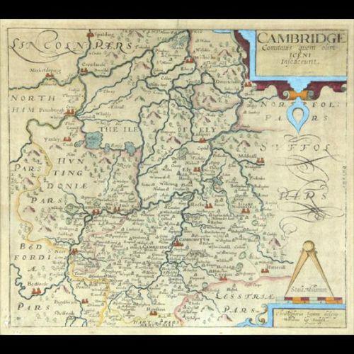 ANTIQUE MAP: Framed hand-colored etching of a map of Cambridge by Christophorus Saxton, the first cartographer to survey England and Wales in 1570; an atlas published in 1577 served as the definitive map of the areas for hundreds of years. This page from the atlas is likely from a mid-18th c. copy. 12.5'' x 11'' image.