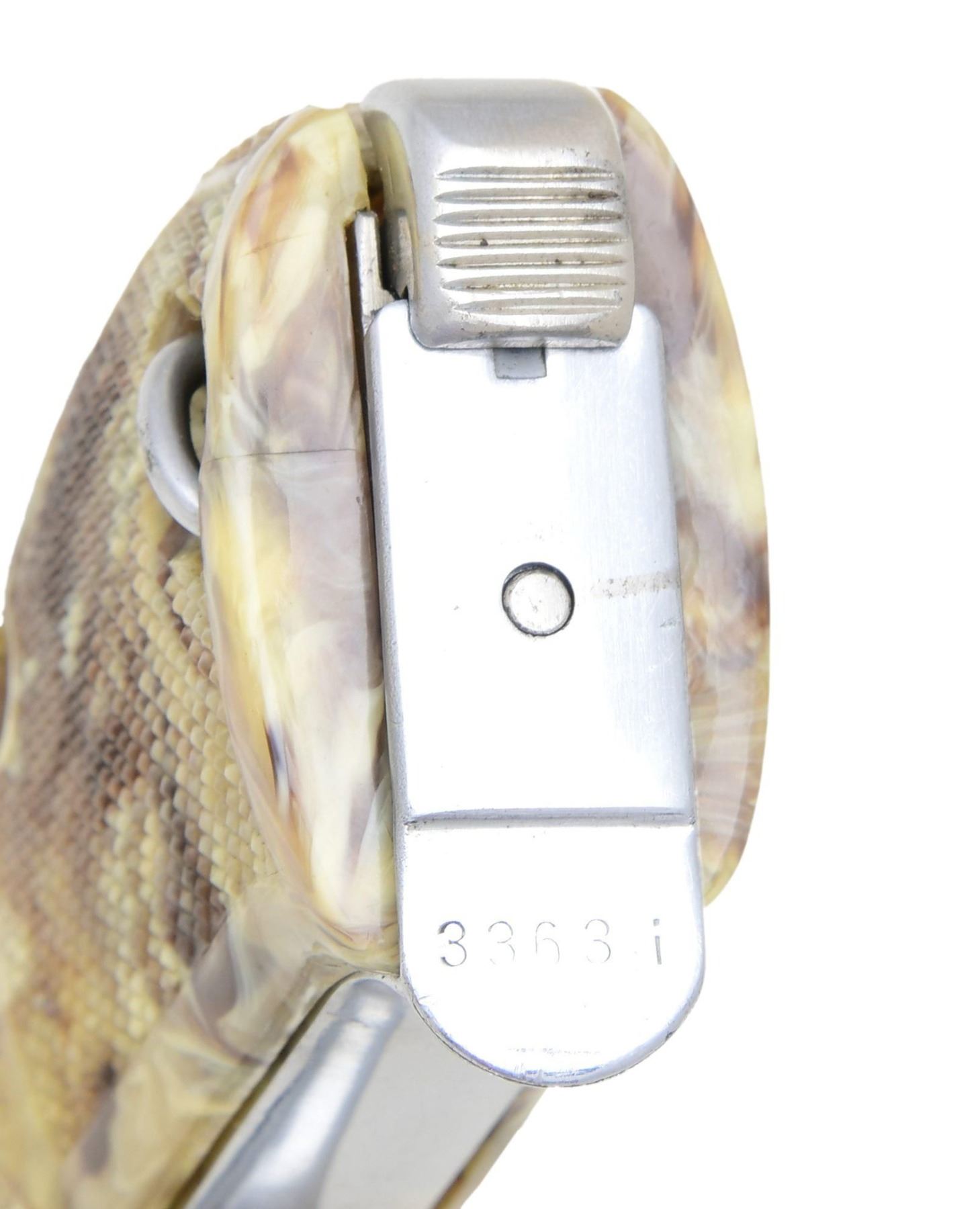 AUTOMATIC PISTOL WITH REPRODUCTION HOLSTER. Cal. 9x19mm Parabellum. S# 3363i. Bbl. 5". P.38 semi-automatic pistol, mfg. by Walther in 1941. Left side of the slide is marked "P.38", followed by Walther's mfg. code and the 2-digit year of mfg. "ac/ 41", and the S#, with Walther Eagle/359 acceptance proofs and an eagle firing proof stamped on the right. Metal components exhibit a reapplied chrome-plated finish overall. Frame is mounted with 2-piece mottled brown, tan, and white checkered plastic grips. All numbers are matching and include the frame, slide, bbl., locking block, and mag. MAGS: one 8-rd. UNATTACHED ACCESSORIES: reproduction brown leather holster. CONDITION: metal components retain the majority of their reapplied chrome-plated finish, exhibiting some superficial handling marks as well as a few scattered spots of flaking overall. Dark, pitted bore, retaining strong rifling throughout. Grips show a few superficial handling marks but are otherwise very good overall. Holster is very good, with a few scattered handling marks. (24-1295/MLW). CURIO. $800-1,200.
