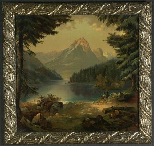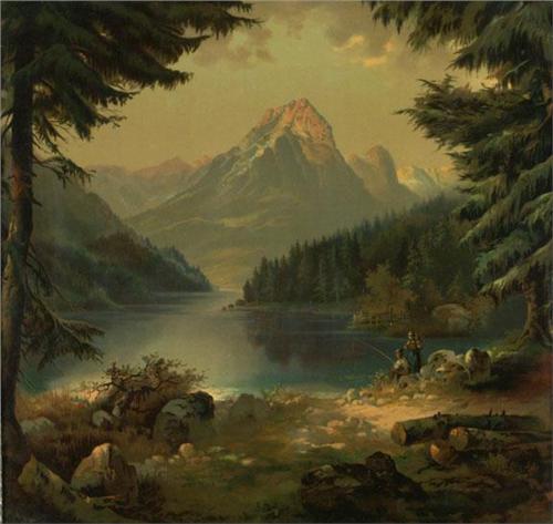 CHROMOLITHOGRAPH ON TEXTURED PAPER 20 7/8'' x 22'', Unsigned. A couple fishing at a mountain lake. Placed in a gilt frame with stylized leaf and berry motif.