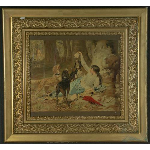 CHROMOLITHOGRAPH 14 5/8'' x 18 1/2'', Unsigned. A Victorian Woman Playing with Dogs. Note condition to include a small tear lower right. Placed in a period goldtone wood and compo. frame, as seen. Paper strips (used as matting) upper and lower edges.
