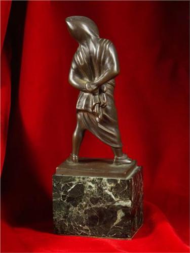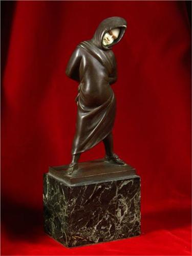 CHRYSELEPHANTINE: Patinated bronze miniature of a little hooded monk figure with an ivory face on a green marble base. Art Nouveau in style, circa late 1800's - early 1900's, unattributed, figure measures 6 1/4'' and base measures 2 1/2''. Marble base is cracked and the face shows some greenish discoloration where the ivory meets the bronze with some additional age cracking noted.