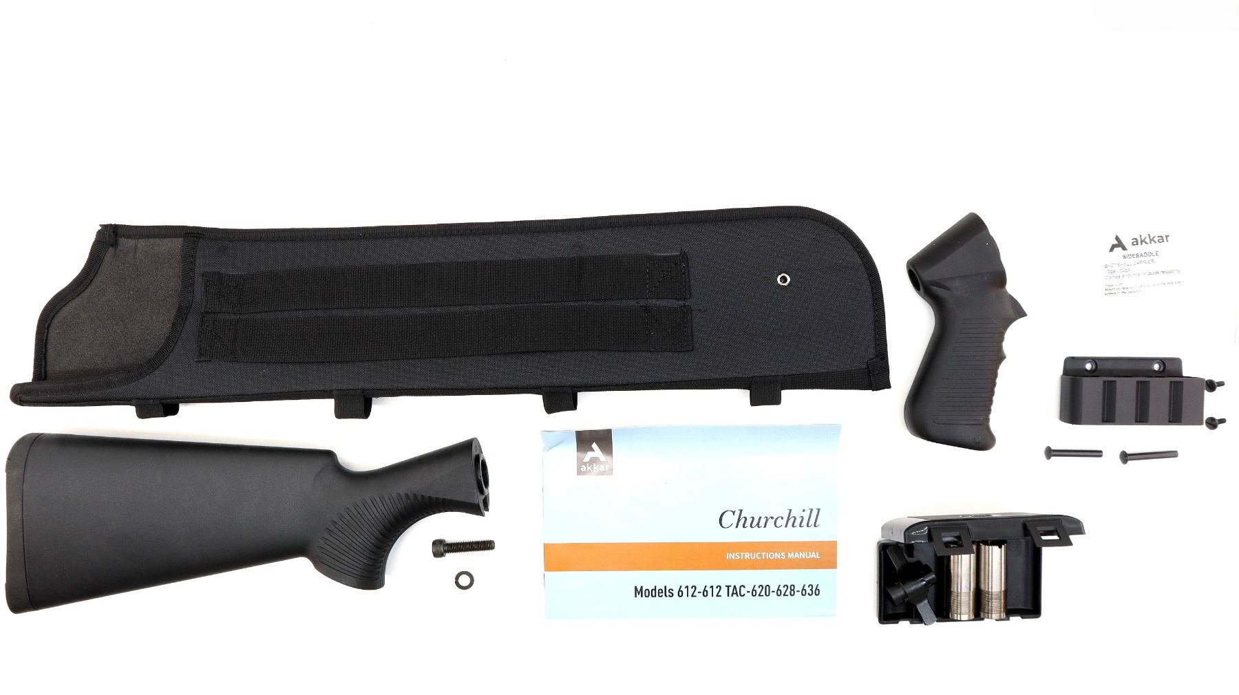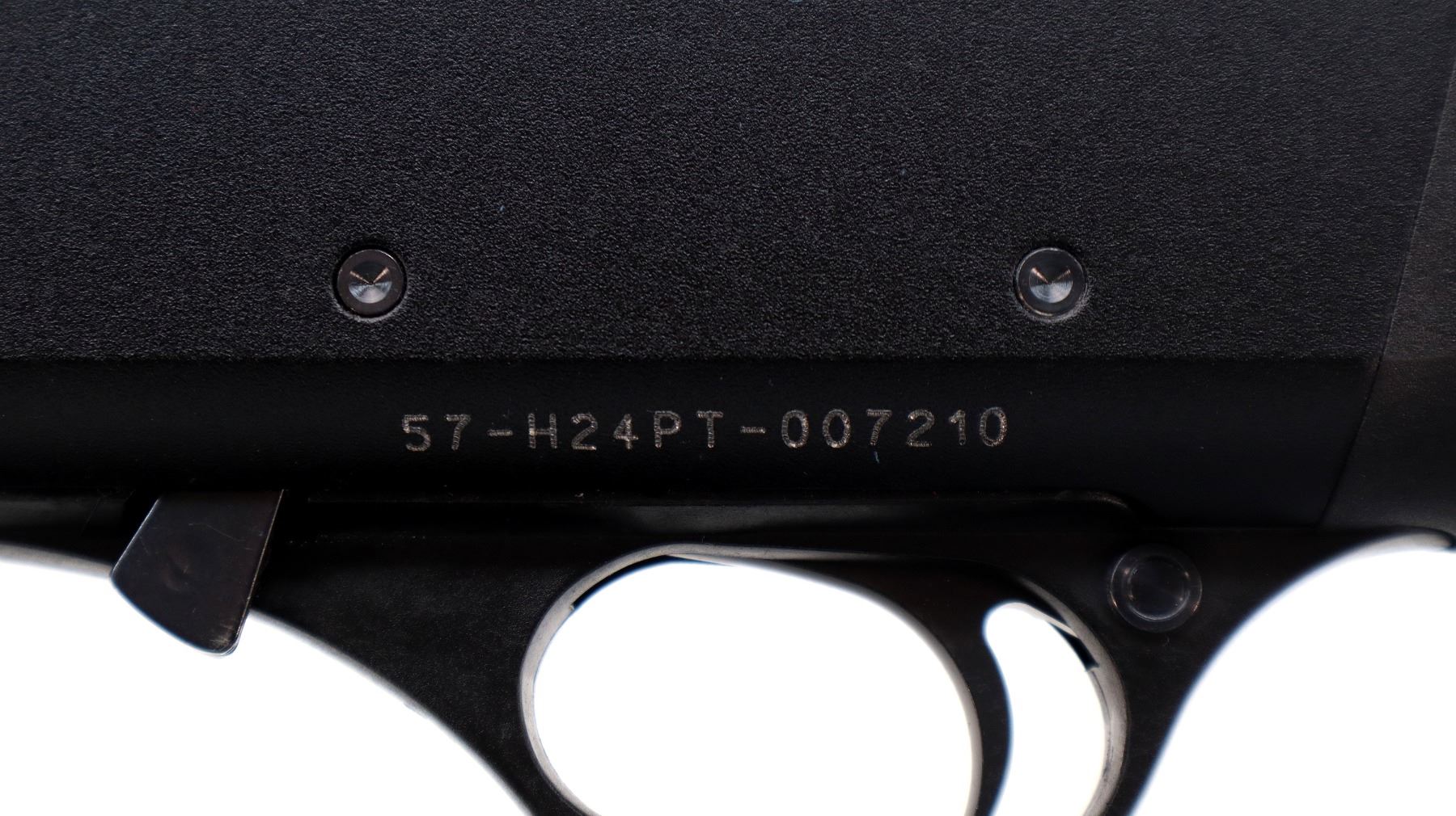 Main Description: Brass bead with ramp, Parkerized round barrel, black alloy receiver. Two piece black synthetic stocks, ventilated grooved extended forearm, grooved pistol grip, extended slide release, full length magtube. Accessories included: Grooved vertical pistol grip, four round side saddle, black synthetic butt stock with pistol grip, spare IM and Full Chokes with wrench and case, black nylon scabbard.