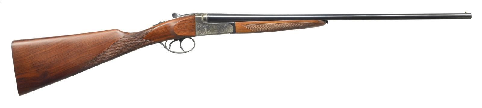 KASSNAR. Cal. 410. S# 357546. 23" Bbls. w/ narrow swamped game rib are marked w/ importer & maker information on tops. Bbl. flats are stamped w/ Spanish nitro proofs for 3" chambers. Coin finished boxlock action features automatic safety & double triggers. Action is roll engraved w/ 60% coverage shaded scroll. Straight grip European walnut buttstock measures 14 1/2" over checkered wood butt. Point pattern checkering is at grip. Matching splinter forend has Anson release. Chokes appear to be full & full. DAC: 1 7/16". DAH: 2 7/16". Weight: 5 lbs 13 oz. CONDITION: very fine. Fairly close to "as new" w/ a few patches of light oxidation on bbls. & a few minor handling marks in wood. Shiny bores. Mechanically good. (20-3992/MGM). MODERN. $350-500.