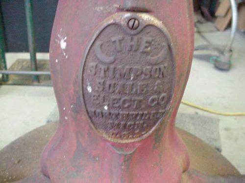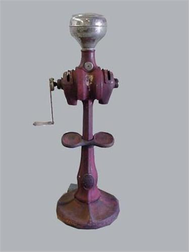 CI pedestal coffee grinder - original paint with yellow stripping/nickel plated hopper/cast iron/plate Stimpson Scale & Electric Co., Northville, MI, USA., 5' x 21"W. "May be one of a kind."