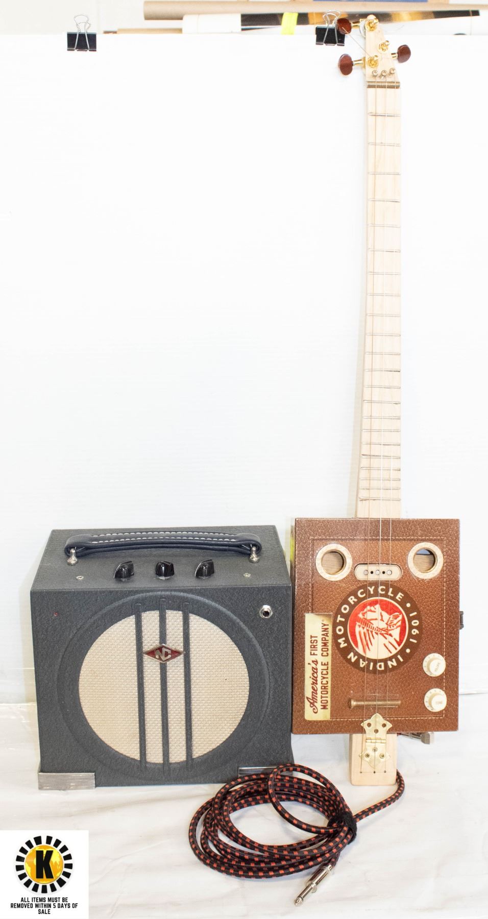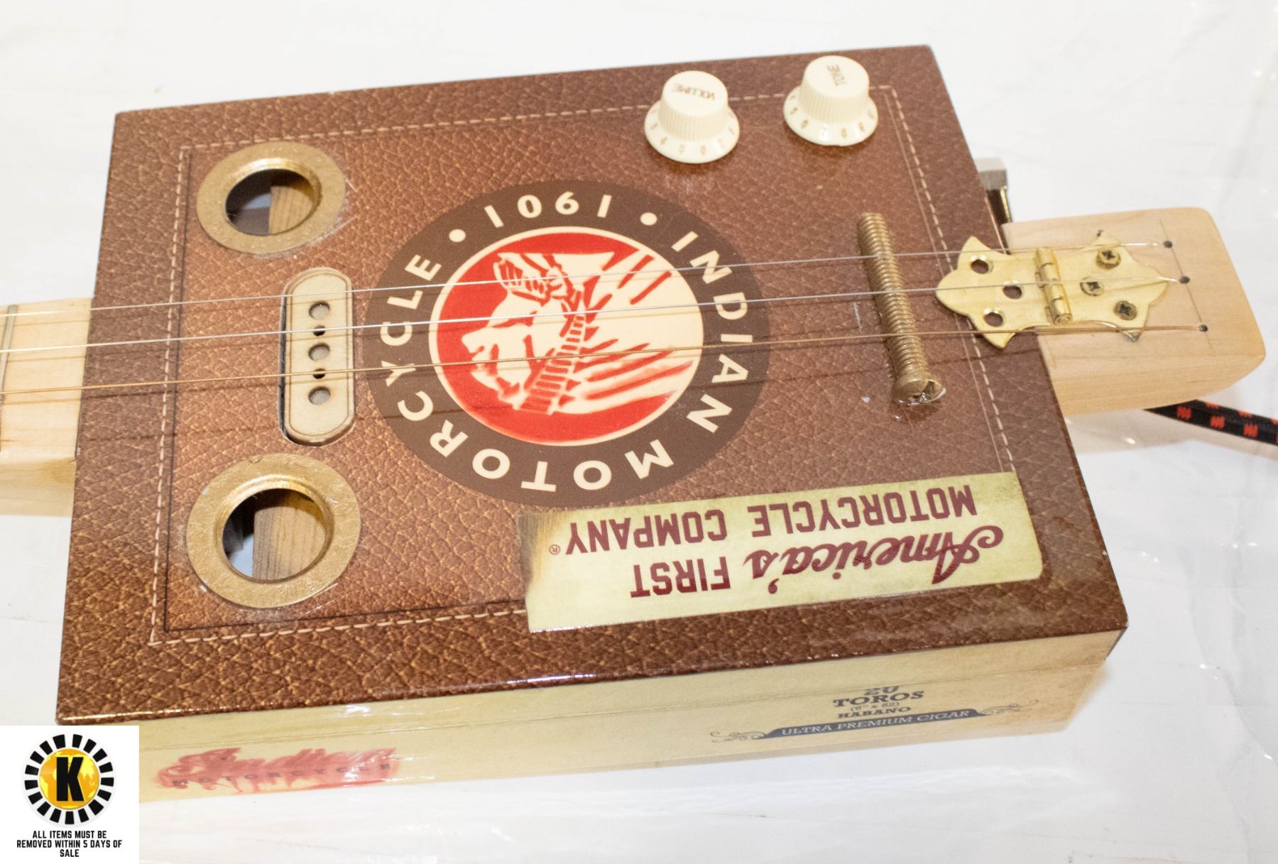 CIGAR BOX ELECTRIC GUITAR C/W AC/DC AMPLIFIER.
