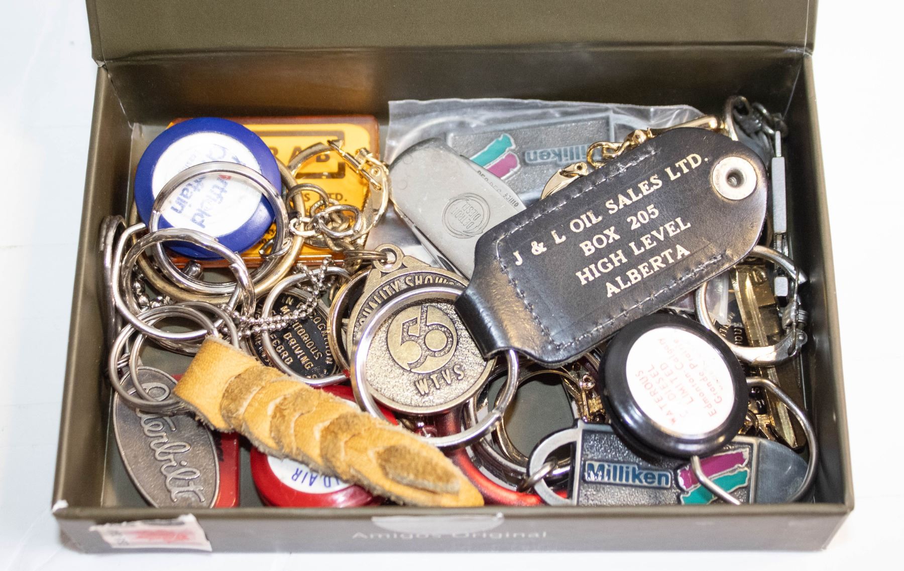 CIGAR BOX FULL OF VINTAGE ADVERTISING KEYCHAINS