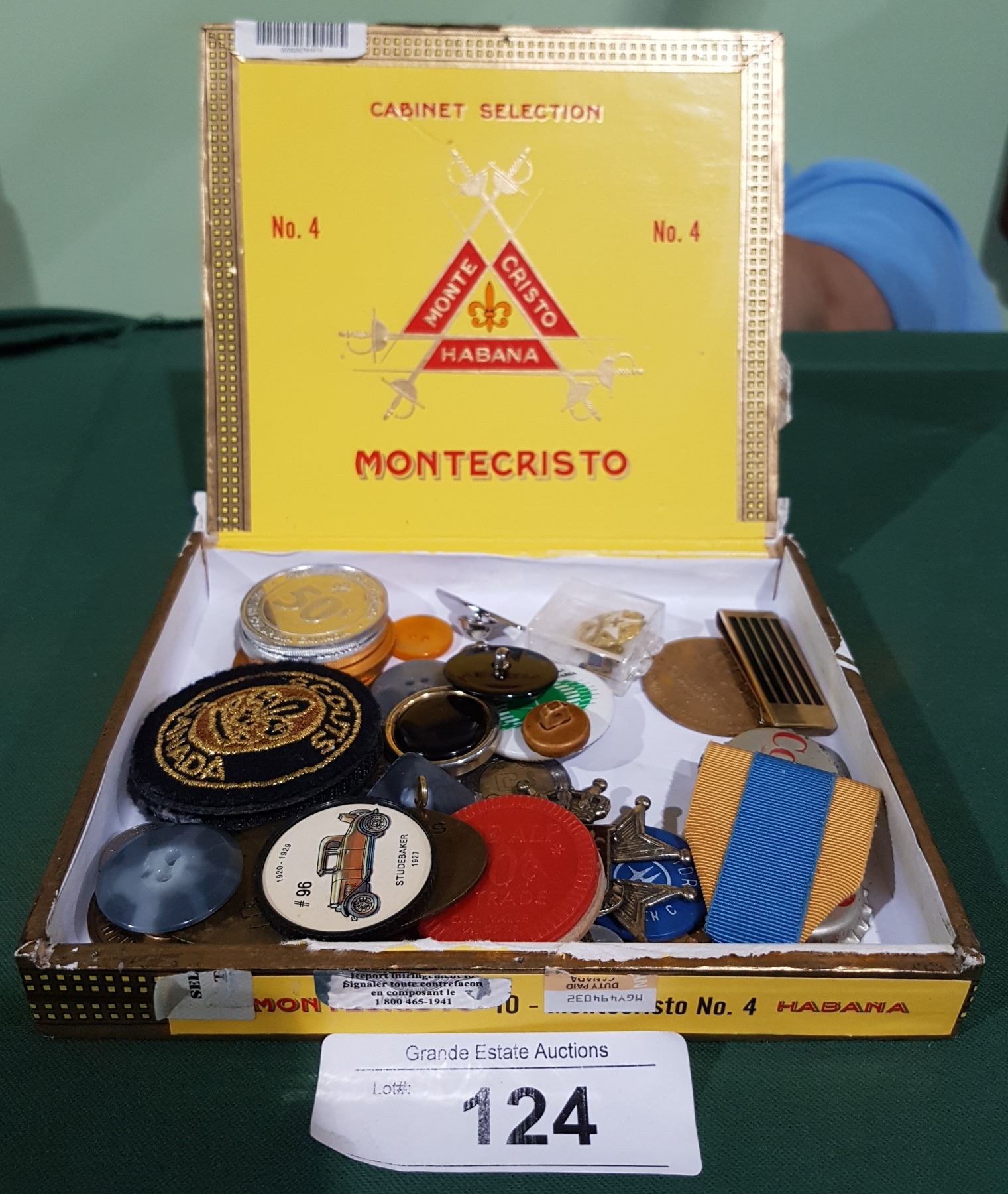 CIGAR BOX W/MISC COLLECTIBLES