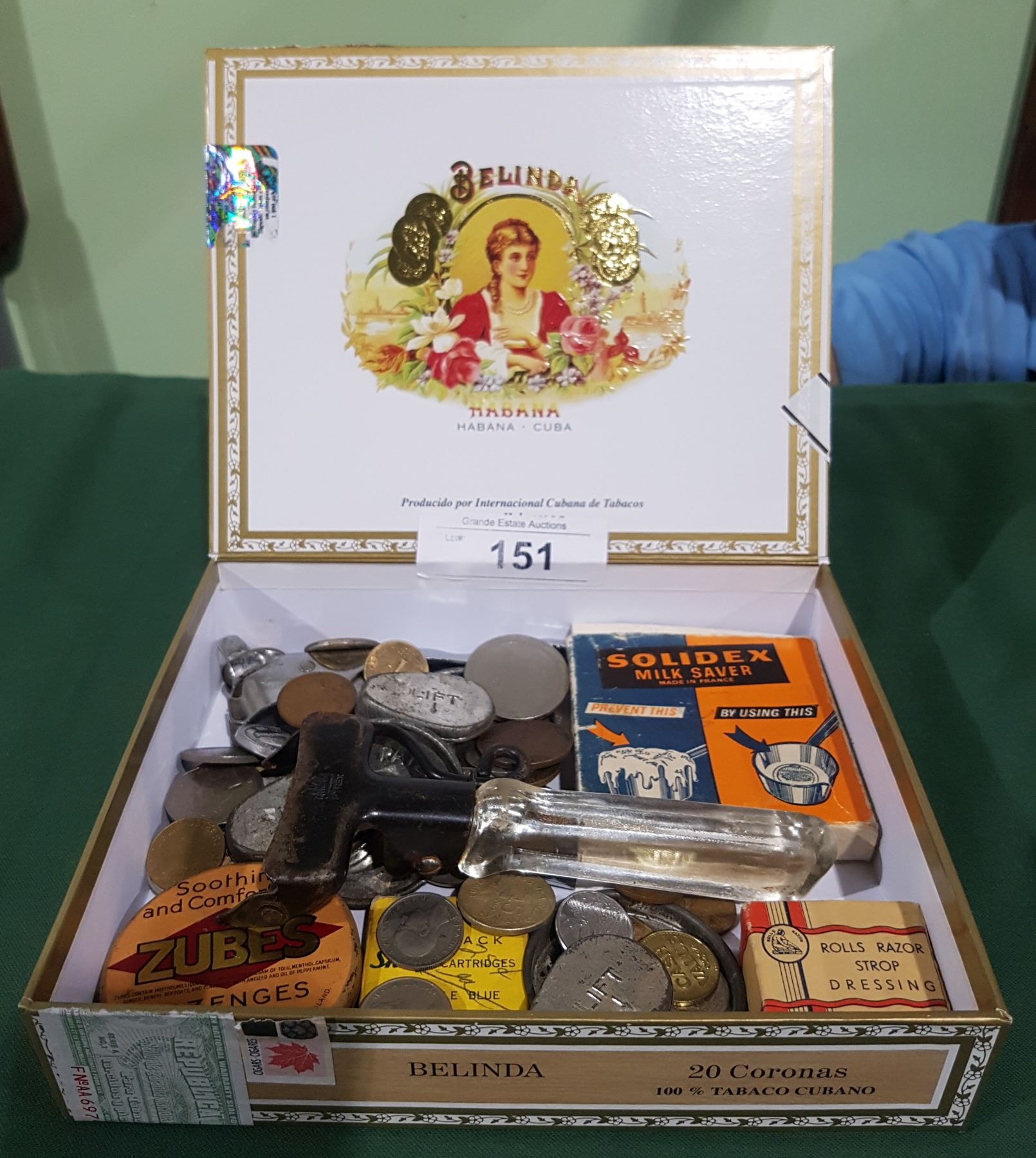 CIGAR BOX W/VINTAGE RAZOR STROP, TINS, WORLD COINS ETC