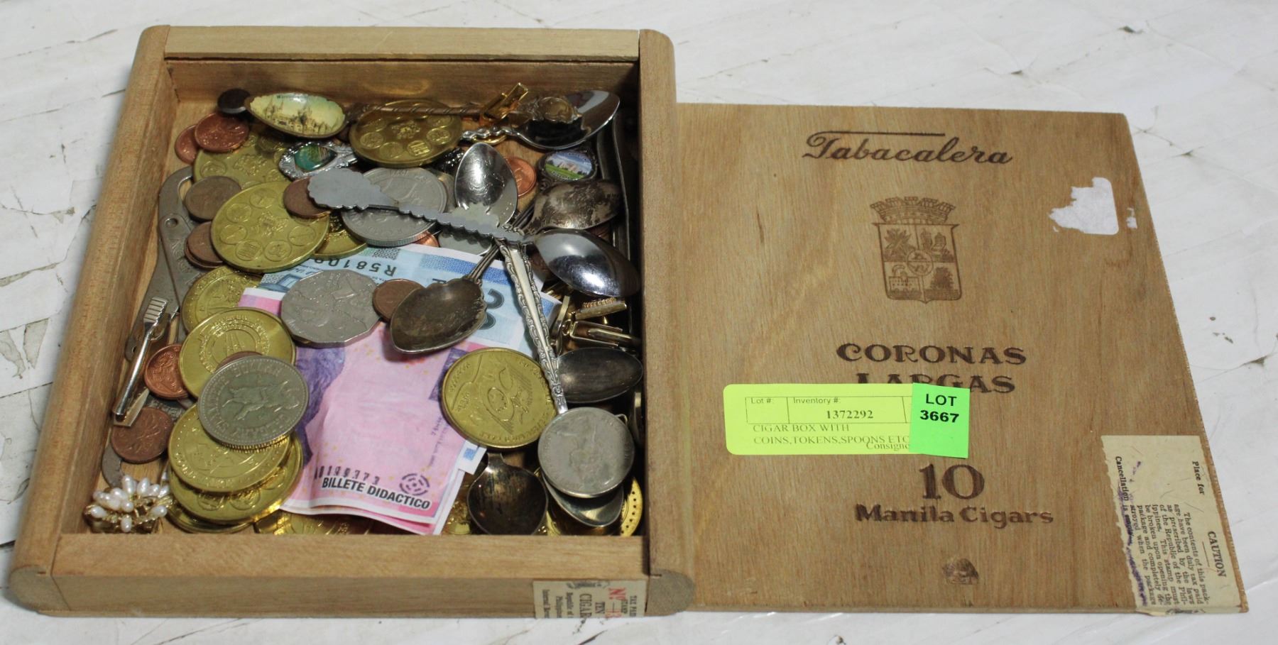 CIGAR BOX WITH COINS,TOKENS,SPOONS ETC