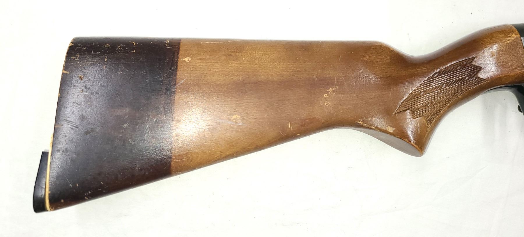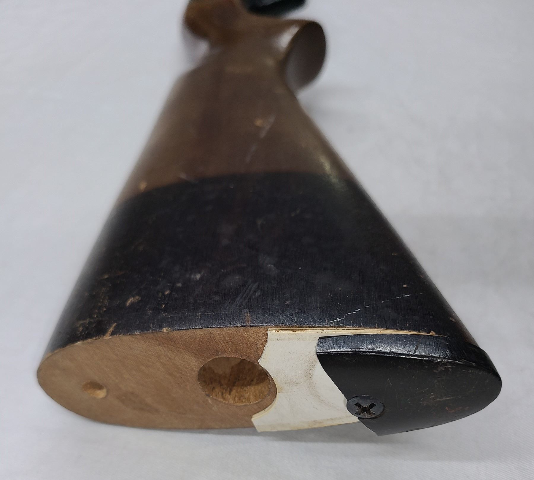 Checkered semi pistol grip and smooth forend. Rear stock has been painted black around butt stock end.