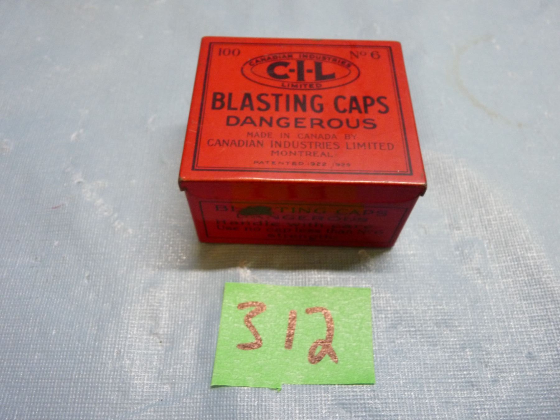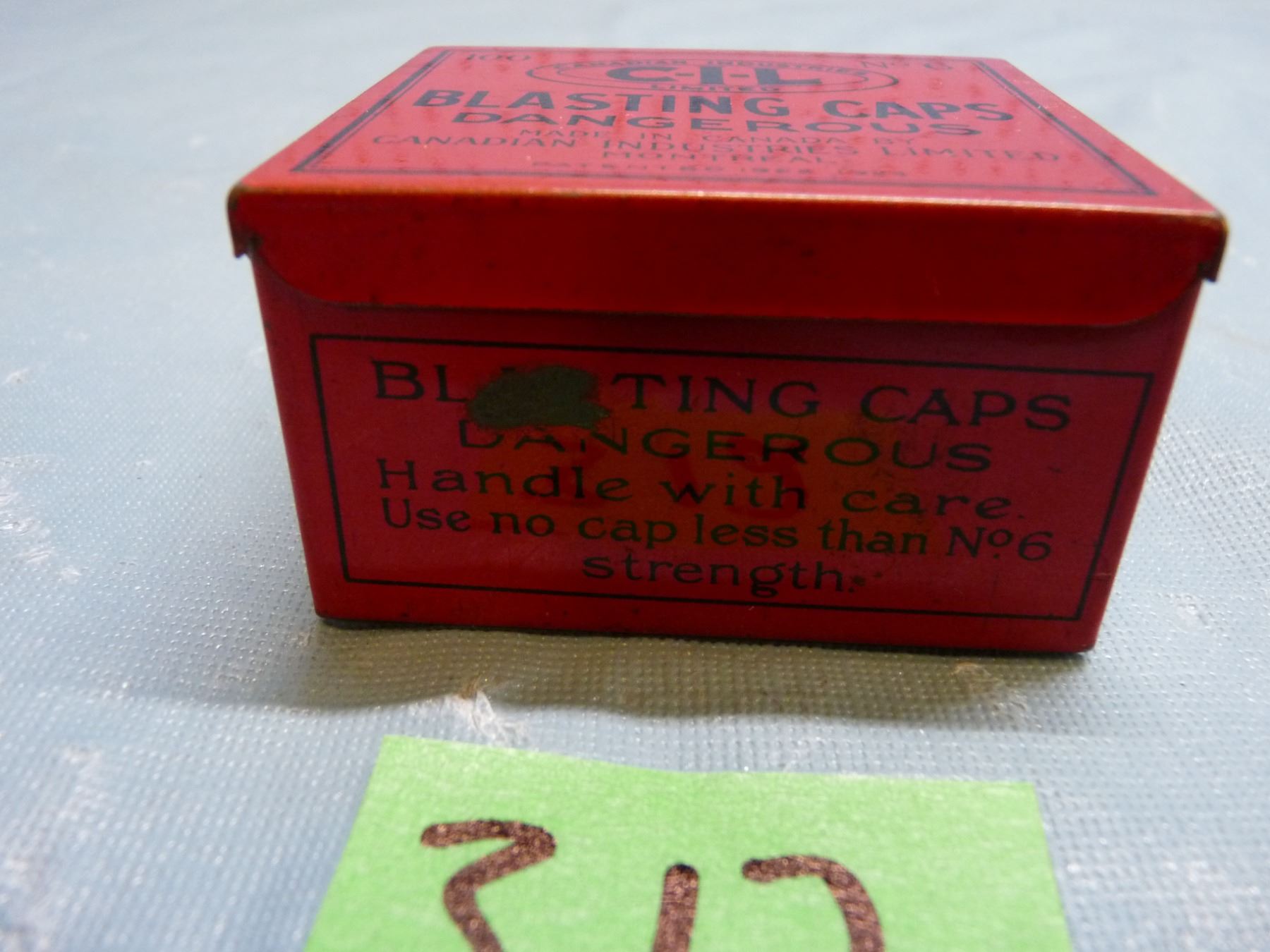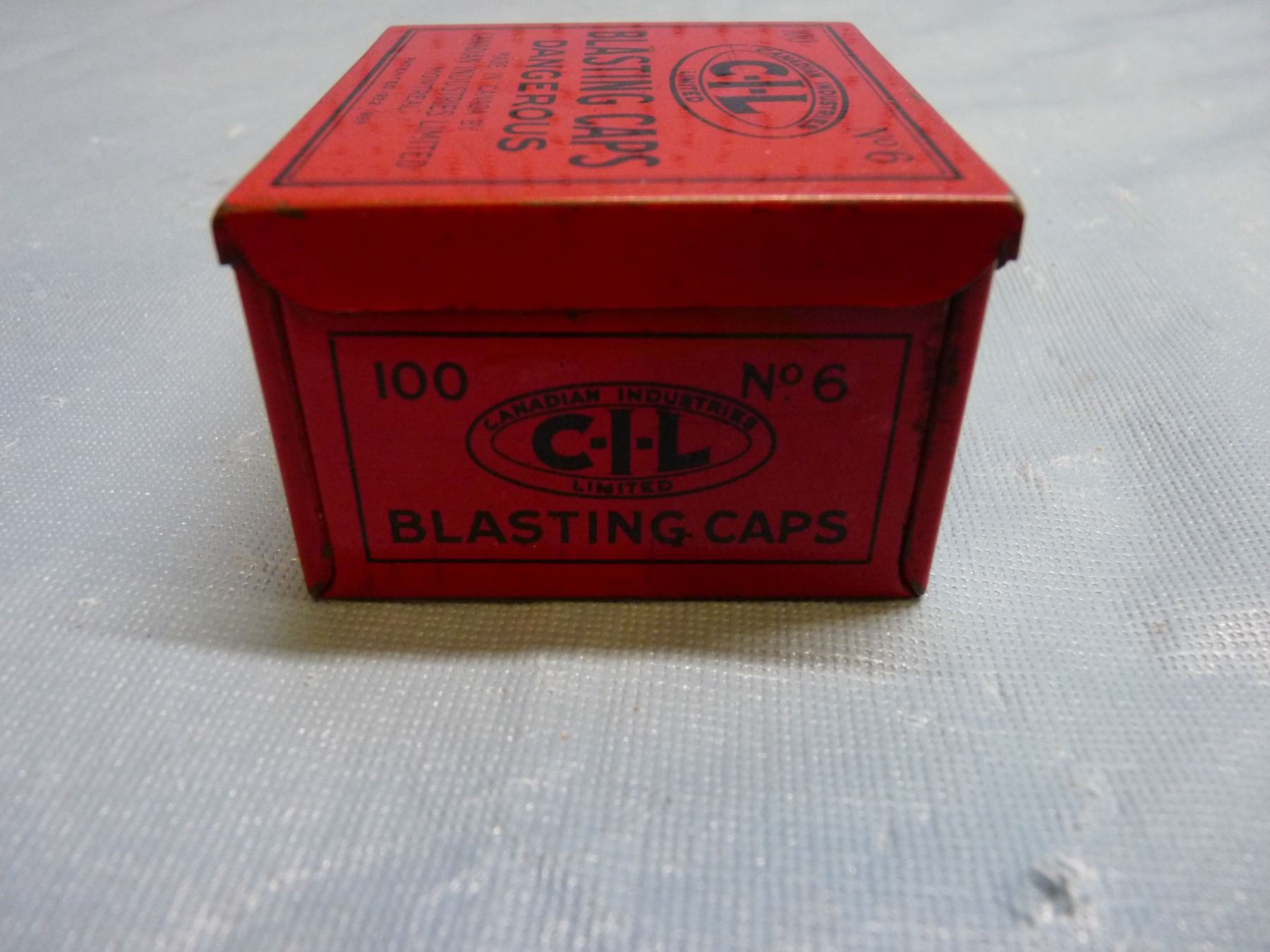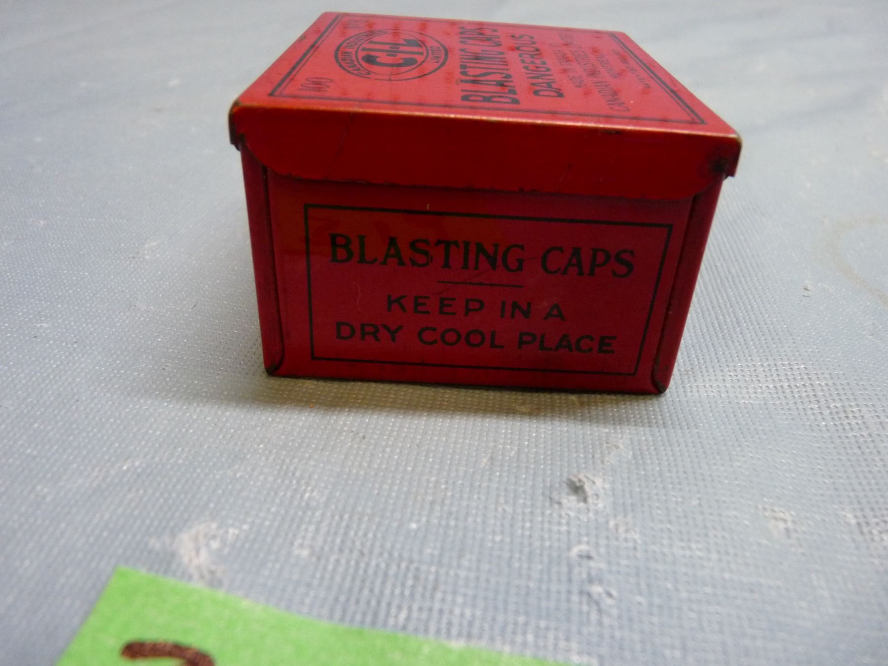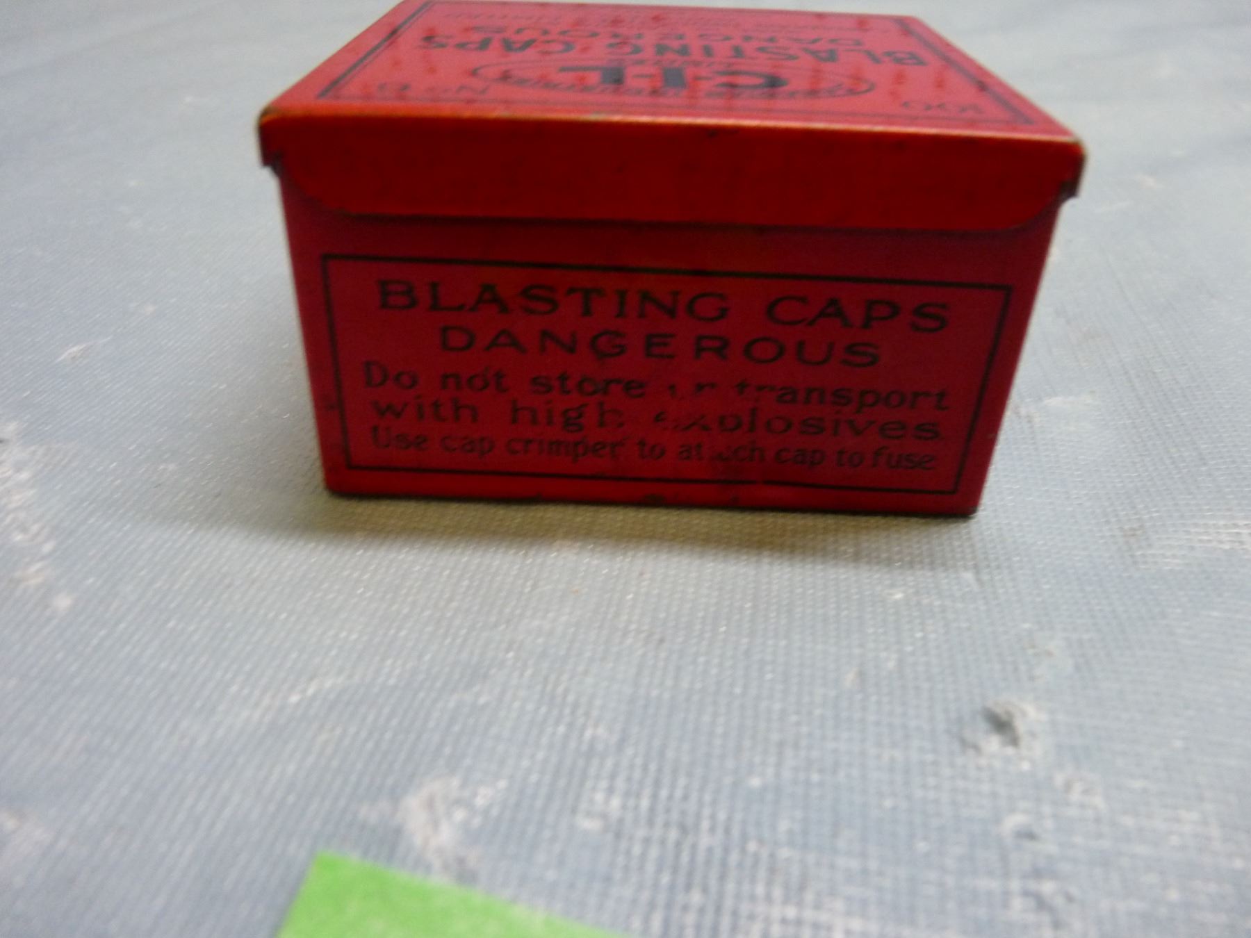 CIL blasting caps red and black tin, marked 1922-24 , excellent condition