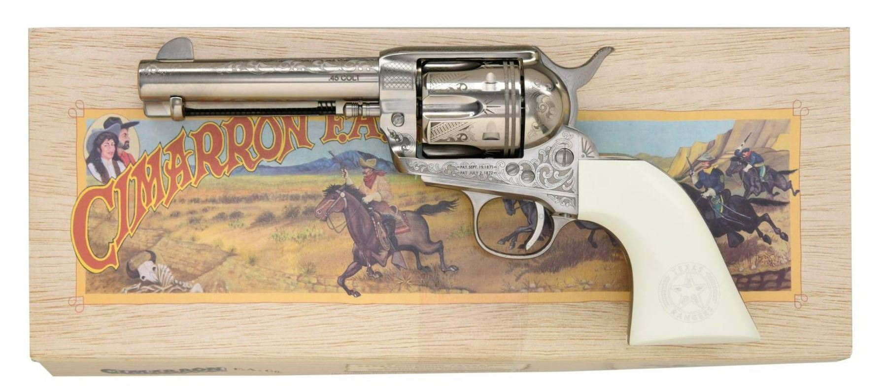 Cal. 45 Colt. S# E149596. Bbl. 4 3/4". Blade front sight. Fixed rear sight. Polished nickel finished SAA style revolver w/ laser floral engraving, a picture of Texas on backstrap & the Ranger motto "ONE RIOT ONE RANGER" on the ejector housing. Faux ivory grips w/ Texas Ranger logo. UNATTACHED ACCESSORIES: matching numbered factory box. CONDITION: all aspects near excellent. PROVENANCE: The Collection of Gun Sport Ltd owned by Jon R. Thomas. (23-4309/MJC). MODERN. $700-1000.