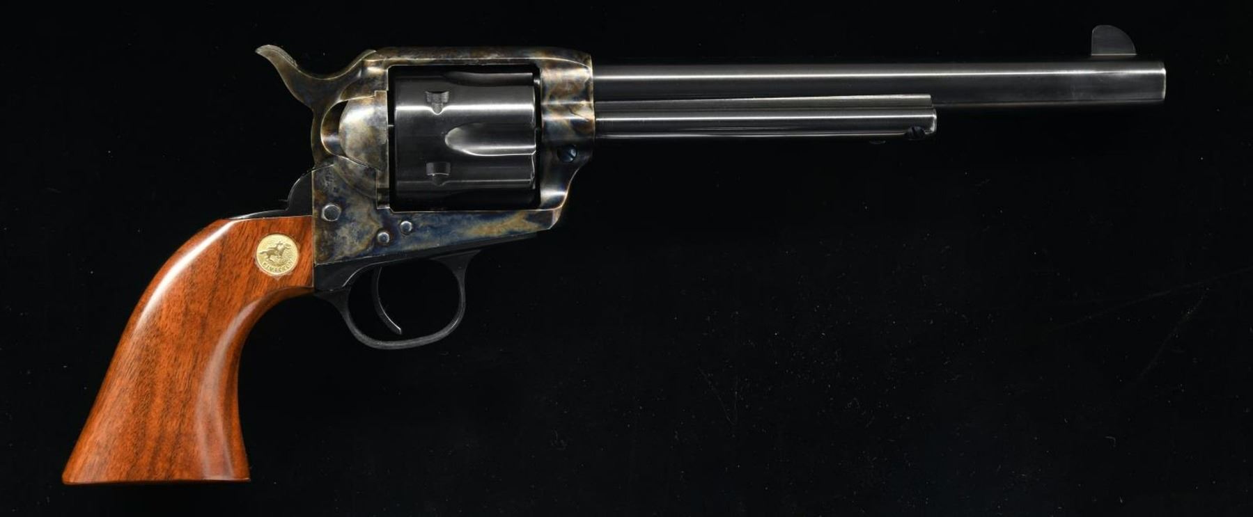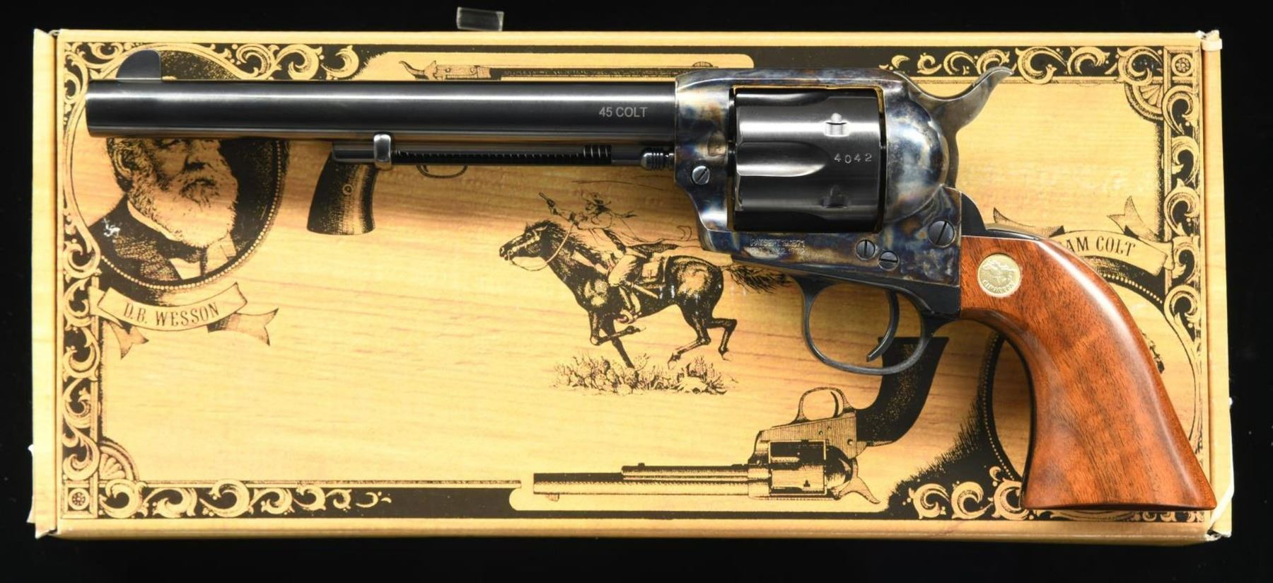 Cal. 45 Colt. S# P74042. Bbl. 7 1/2". Blade front sight. Fixed rear sight. Cimarron replica 1873 SAA revolver. Case colored frame, loading gate & hammer. Other parts are blued. Smooth walnut grips w/ gold Cimarron medallions. UNATTACHED ACCESSORIES: matching numbered factory box w/ manual, paperwork & cable lock. CONDITION: all aspects near excellent. PROVENANCE: The Collection of Gun Sport Ltd owned by Jon R. Thomas. (23-3987/MJC). MODERN. $350-550.