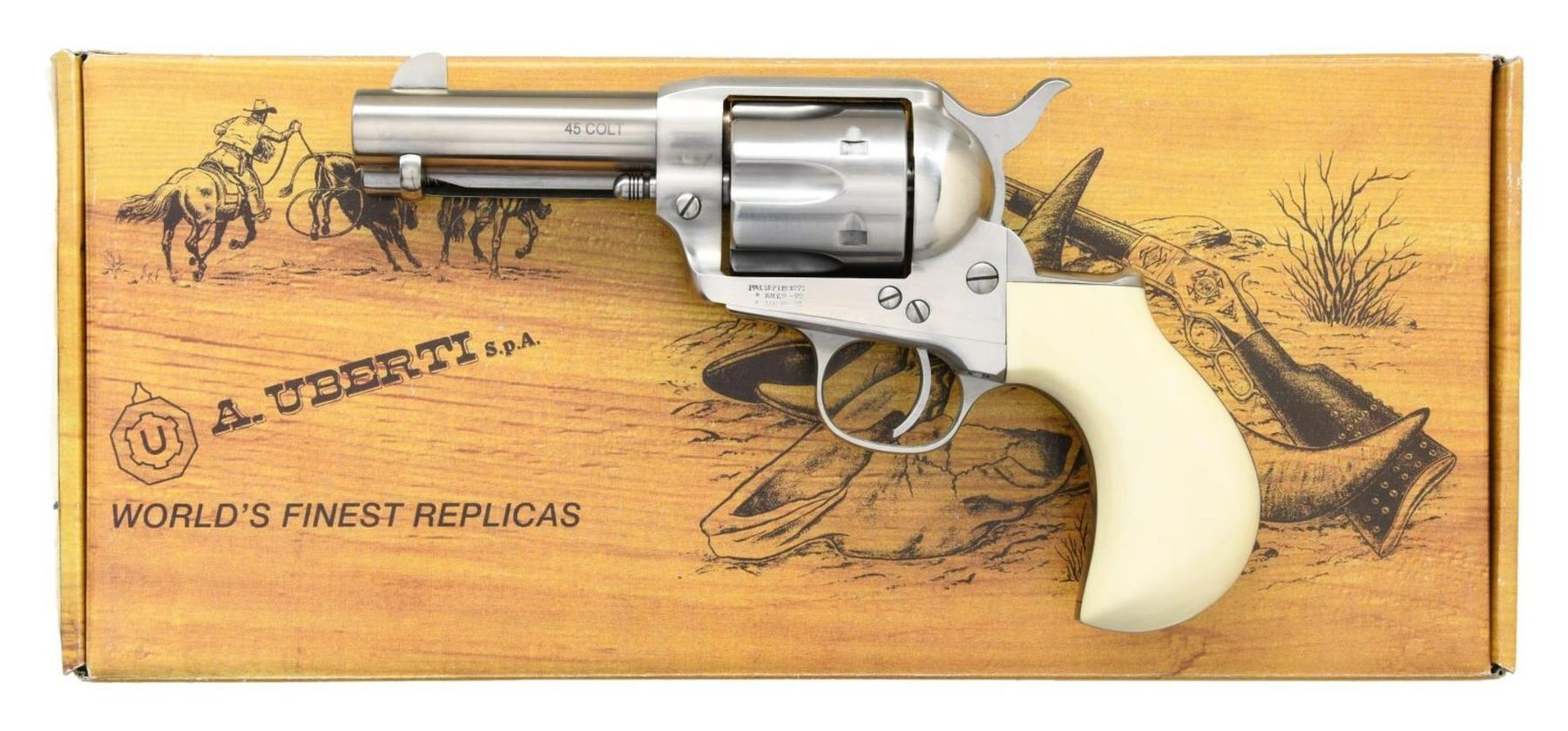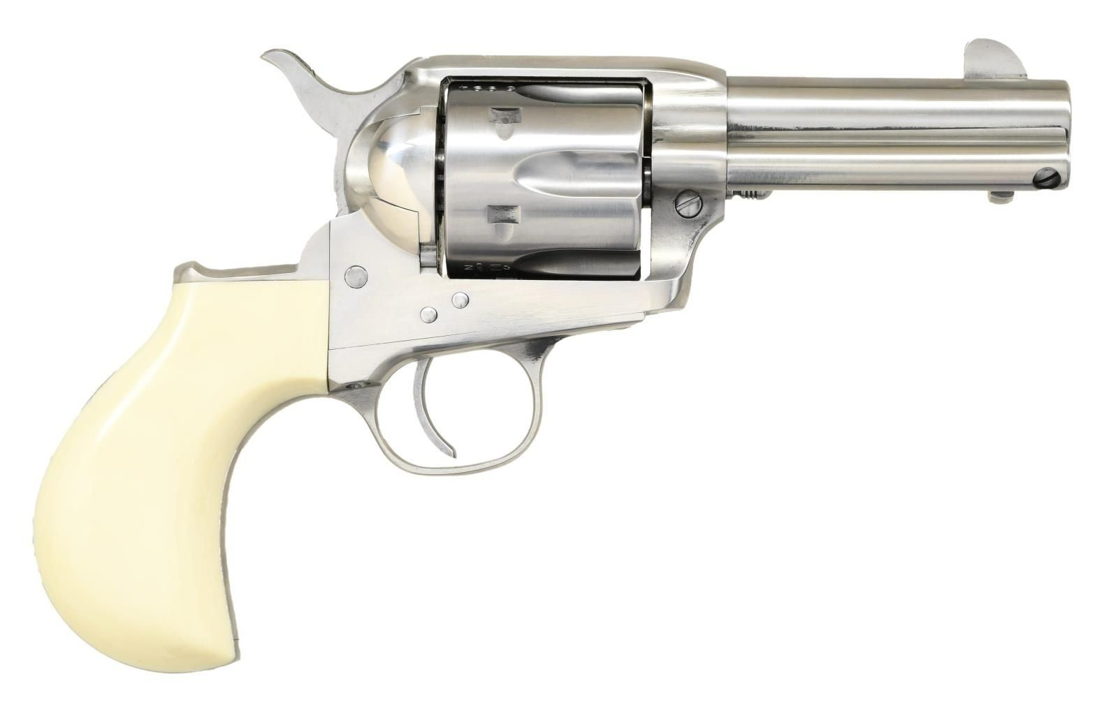 Cal. 45 Colt. S# N15994. Bbl. 3 1/2". Blade front sight & fixed rear sight. Stainless finish. Backstrap has "Doc Holliday inscription" w/ floral accents. Simulated ivory birds head grips. UNATTACHED ACCESSORIES: matching numbered factory box w/ manual & paperwork. CONDITION: all aspects are near new in the box. PROVENANCE: the Collection of Gun Sport Ltd owned by Jon R. Thomas. (23-2830/MJC). MODERN. $700-1000.
