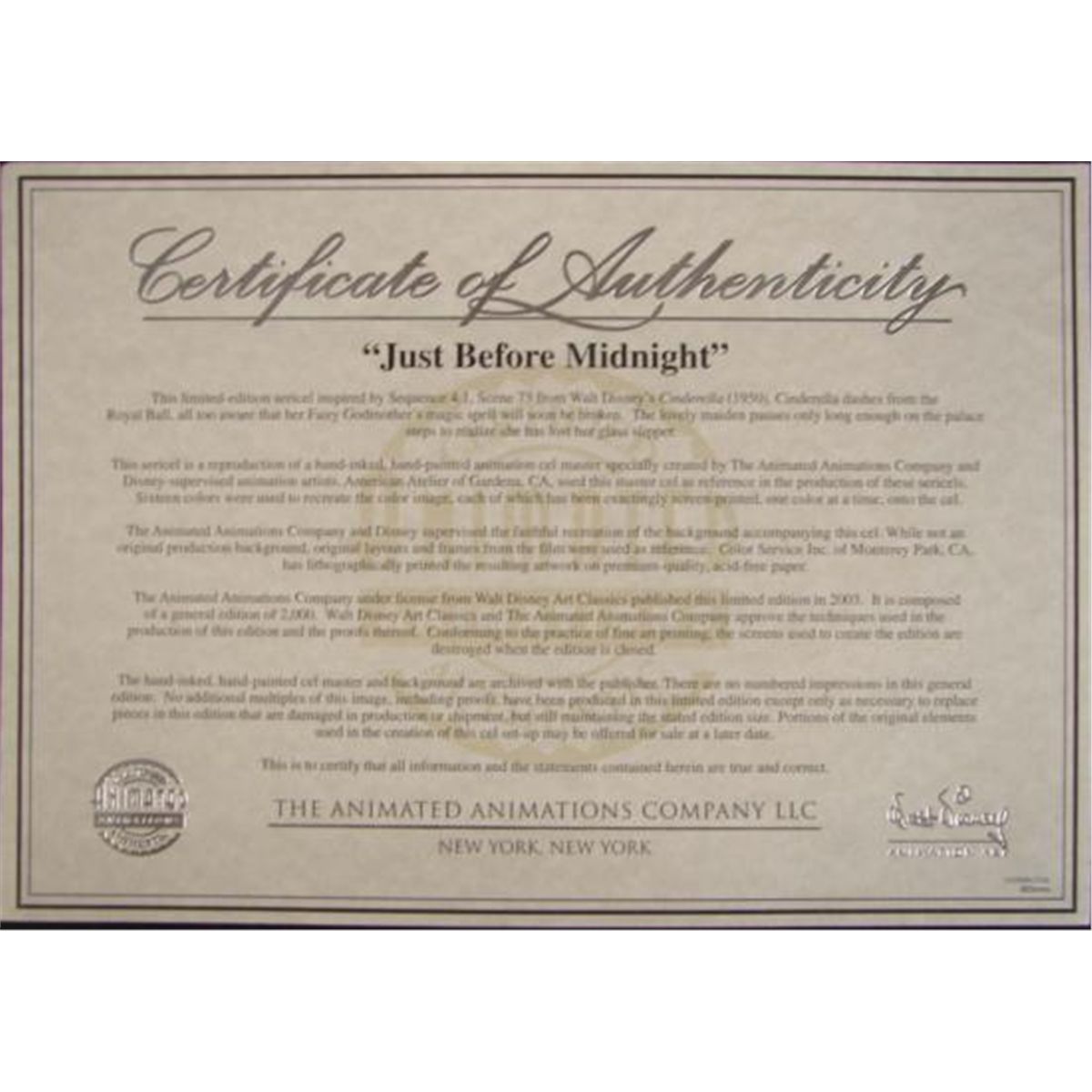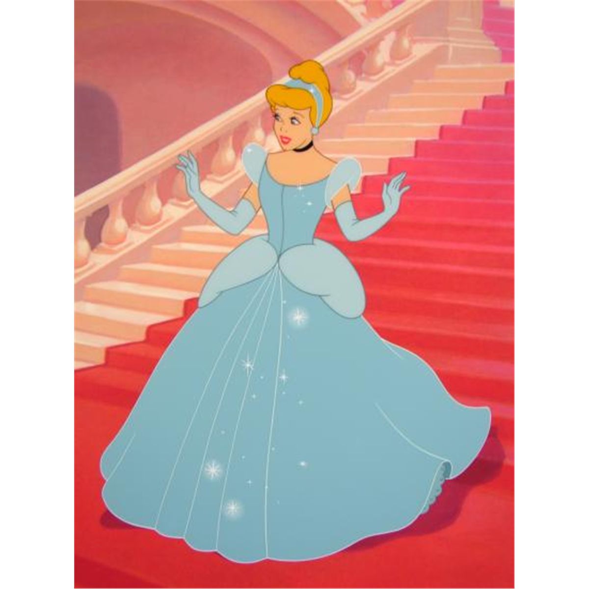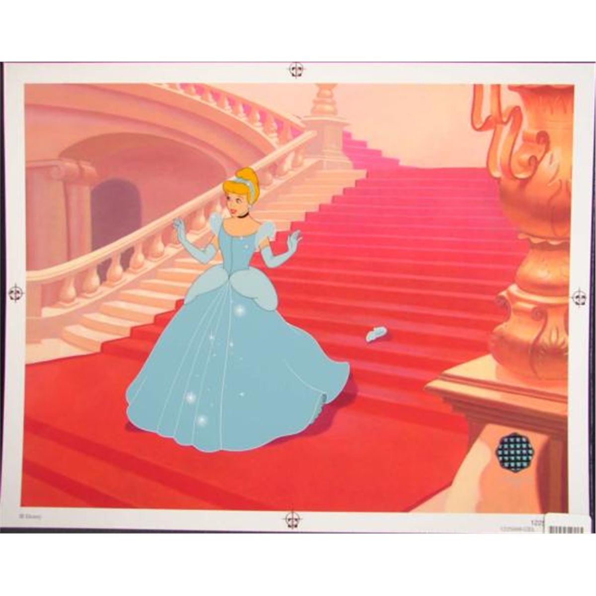 Featured here a Limited Edition Sericel inspired by one of the many magical scenes in Walt Disney's film Cinderella (1950).  Here Cinderella hastily leaves the  Royal Ball.  Surely Cinderella is worried her Fairy Godmother's magic spell will soon be broken!  This Sericel comes with a background image of the Royal Ball.   *  *  *  *  Title: Just Before Midnight *  Medium: Sericel *  Published by: Animated Animations *  Date of Publication:  2003 *  Sericel Size: 6 inches times 7½ inches *  Background Size: 10½ inches times 13 inches *  Numbered from an edition of 2,000 *  Excellent Condition *  Publisher's Certificate of Authenticity on verso *  *  *  *  * Here's what the Certificate of Authenticity has to say: *  *  * This Sericel is a reproduction of a hand inked, hand painted animation cel master specially created by The Animated Animations Company and Disney supervised animation artists.  American Atelier of Garden, CA, used this master cel as a reference in the production of these sericels.  Sixteen colors were used to recreate the color image, each of which has been exactingly screen printed, one color at a time, onto the cel. *  *  * The Animated Animations Company and Disney supervised the faithful recreation of the background accompanying this cel.  While not an original production background, original layouts and frames from the film were used as reference.  Color Service Inc. of Monterey Park, CA, has lithographically printed the resulting artwork on premium quality, acid free paper. *  *  * The Animated Animations Company, under license by Walt Disney Art Classics, published this limited edition in 2003.  It is composed of a general edition of 2500 sericels.  Walt Disney Art Classics and The Animated Animations Company approve the techniques used in the production of this edition and proofs thereof.  Conforming to the practice of fine art printing, the film used to create the background is destroyed when the edition is closed. *  *  * The hank inked, hand painted cel master and background are archived with the publisher.  There are no numbered impressions in the general edition.  No additional multiples of this image, including proofs, have been produced in this limited edition except as necessary to replace pieces in this edition that are damaged in production or shipment, but still maintaining the stated edition size.  Portions of the original elements used in the creation of this cel set up may be offered for sale at a later date. *  *  *  * Remember the magic of Cinderella with this breathtaking Sericel  — the dedicated Disney collector cannot be without this Limited Edition work!!