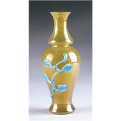 Lot 420 CINTRA VASE WITH APPLIED DECORATION Wonderful amber cintra vase has applied light blue leaves and vine across the front. Vase is very similar in size and style to a Steuben example shown on page 142 of Grover’s book “Art Glass Nouveau”. SIZE: 11” t. CONDITION: Tiny fleabite to edge of foot, otherwise very good. 5-70248