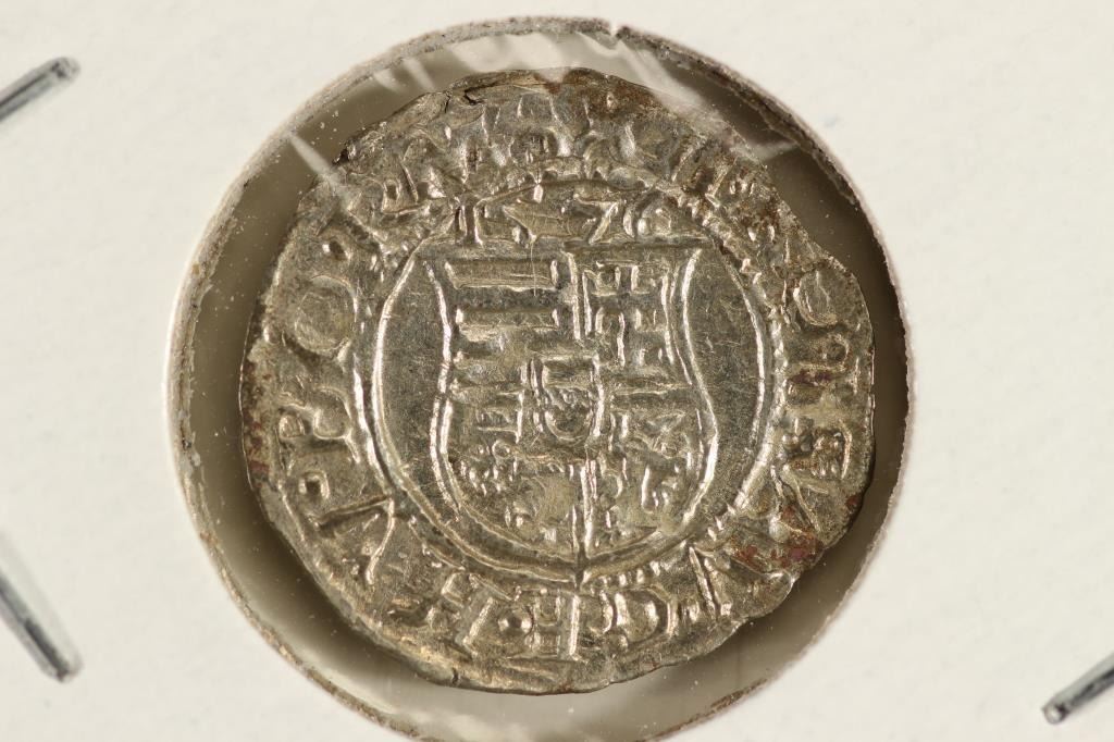 HOLY ROMAN EMPIRE AR DENAR DEPICTING THE HUNGARIAN COAT OF ARMS WITH MADONNA AND CHILD VERSO.