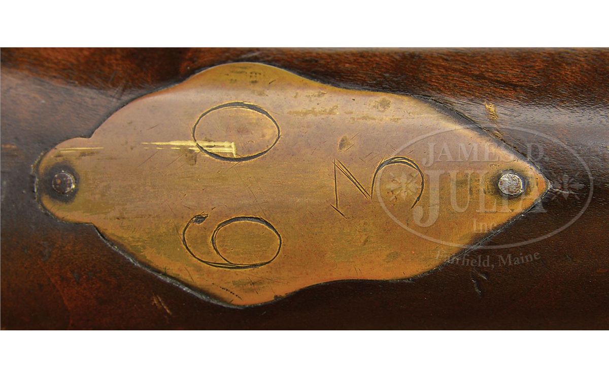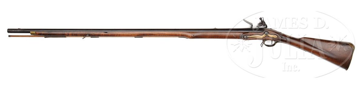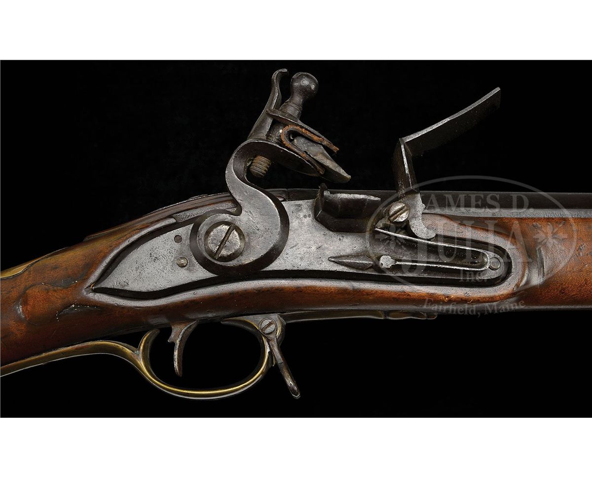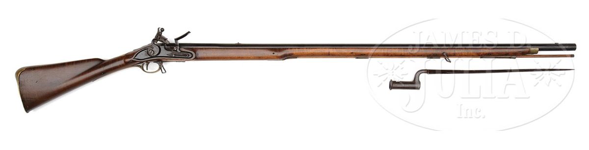 NSN. .78 Cal. X 46-1/4" long unmarked rnd bbl having a faceted breech for 6-1/2" and a rear sight 8-1/2" forward of breech. 6-1/2" long unmarked Dutch banana shaped lock. Brass furniture consists of nose cap, 4-rammer pipes, 11" long trigger guard of British pattern, 3-step buttplate tang, rounded side plate in fashion of British Long Land Pattern and almost diamond shaped escutcheon plate engraved "60/3" wrist apron. This is the only marking on the outside of the gun, "WM" scratched inside the lock. Has both orig swing swivels and a wooden ramrod, not orig. 58-1/2" long stock shows evidence of British and European influence, although it's origin is unknown. Gun comes with its matching bayonet having a 17" blade of British pattern with a European Crown stamped near the base of blade. PROVENANCE: Collection of Dr. Douglas Sirkin. CONDITION: All iron has a mellow dark patina that matches its age, as does the brass furniture, having a broken off screw at the back of the trigger guard that holds escutcheon in place. Very nice condition having minor nicks and dings with a 3" long scratch on right side of butt, not affecting overall appearance of this musket. 4-50021 PAS13