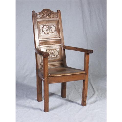 ARM CHAIR: Circa 1750 Italian provincial carved walnut high back arm chair.