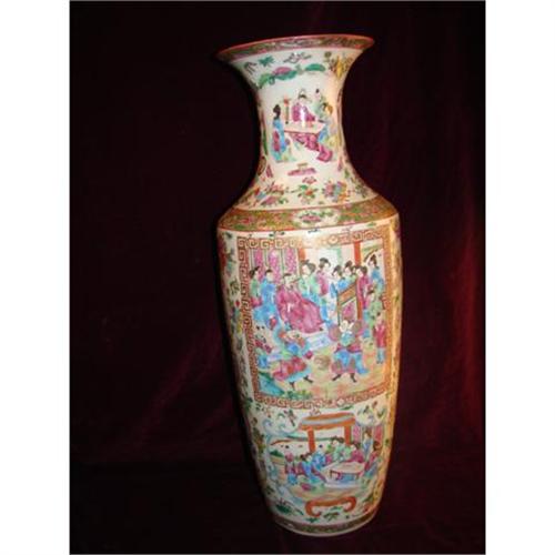 Circa 1820 Chinese Export Rose Mandarin Palace Vase measuring 24" in height. Recently purchased out of a New City Estate. This is a Fantastic Rose Mandarin Vase with a beautiful Greek Key Border. Many different small quadrant views of different scenes on this vase. Beautiful Enamels of anything you can think of.This artist should go to the front of the class. I guess that is why there are so many scrolls on this vase. GREAT QUALITY.