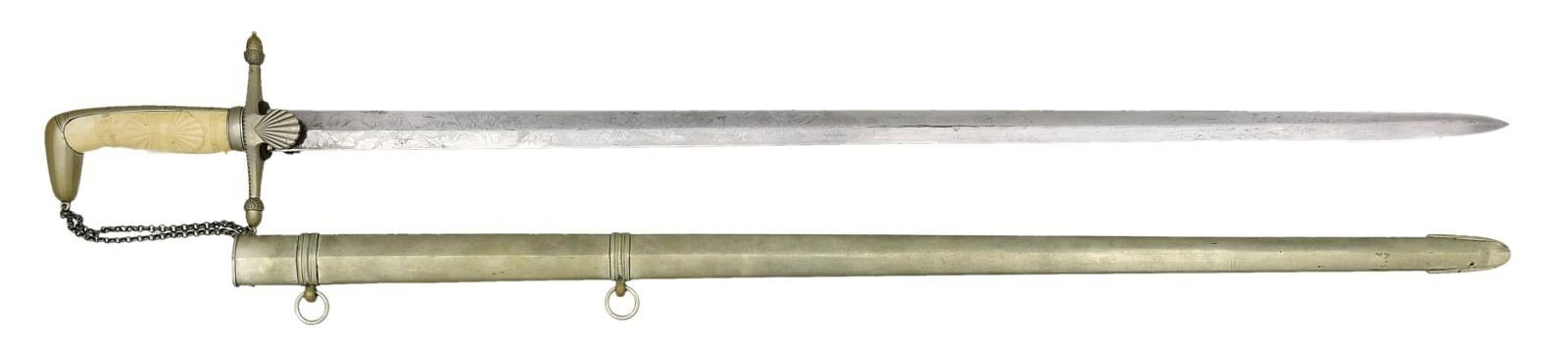 Overall length: 34 7/8". Blade length: 29". Blade has a raised medial ridge and is etched over the first 14 1/2" with various foliate & patriotic motifs. Plated brass hilt with a simple crossguard terminated with an acorn on each end. There is a scallop shell languet on both sides. Chain guard with pistol grip pommel and 3 engraved stars on the backstrap. Carved certifiably antique ivory grip. Plated brass scabbard with a raised medial ridge. CONDITION: blade has a light gray patina with somewhat light etching. Hilt shows light wear overall with a couple tight age cracks to the grip. Scabbard shows light wear with no notable damage. (02-20053/BF). $800-1,200.