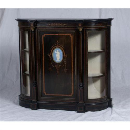 SIDE CABINET: Circa 1860-80 English Victorian demilune ebonized side cabinet, marquetry inlay, burlwood crossbanding, ormolu trim, Wedgewood blue center classical plaque. 41''h x 17''d x 47''w