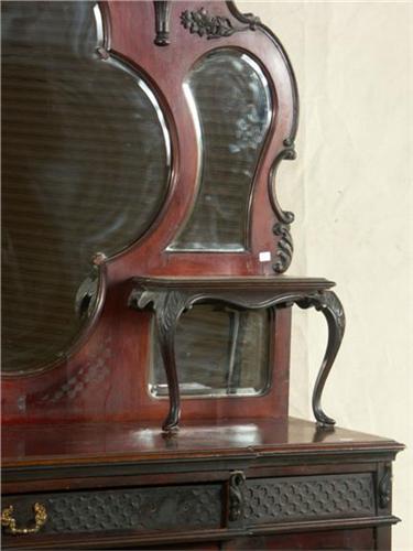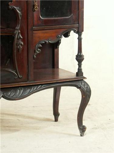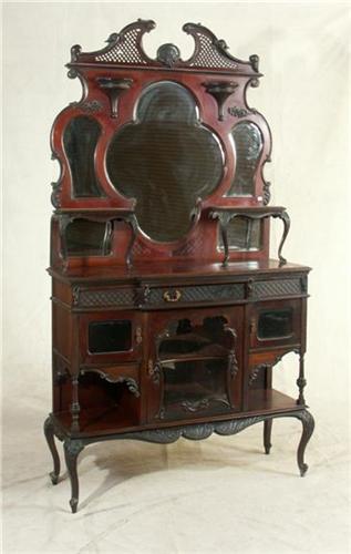DISPLAY CABINET: Circa 1870-90 Chippendale Revival mahogany display cabinet, in two parts, pierced and relief carving, beveled mirrors, cabriole legs. Note: missing upper carved applique for lower glass door and brass drawer pull. 89''h x 17''d x 49''w