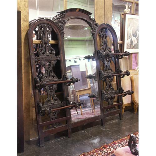 HALL STAND?: Circa 1870 walnut Neo Renaissance upper part of hall stand?, ornately carved, number of towel bars flanking large center mirror.