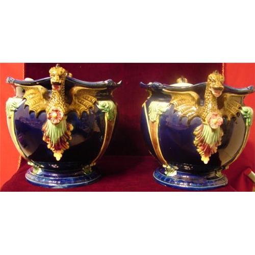 Circa 1870 Pair of Majolica Planters/ Cache Pots in nice blue cobalt colors in Excellent Condition and Very Good Quality. Painted Green on the inside. These planters have a nicely decorated sea horse on each side of each planter. These planters are 9" in height and 10" in diameter. I believe these to have been made in a factory in England in the last quarter of the 19TH Century.