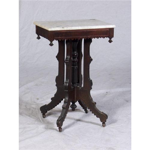LAMP TABLE: Circa 1880 Eastlake lamp table, white marble top, carvings, casters. 30''h x 14''d x 20''w