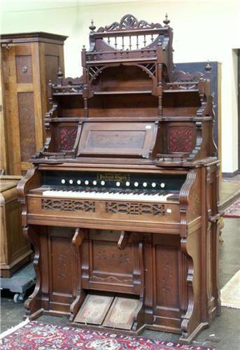 PUMP ORGAN: Circa 1880 Eastlake walnut Packard pump organ, in two pieces, pierced and intaglio carving, turned finials ans spools. 77''h x 24''d x 45''w