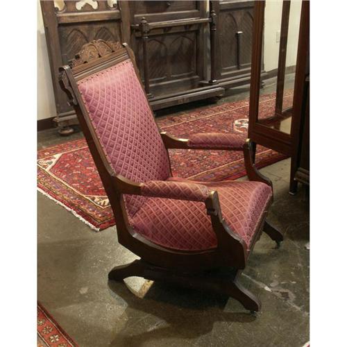 ROCKER: Circa 1880 Eastlake walnut rocker, block carved crestrail, rose diamond pattern fabric.
