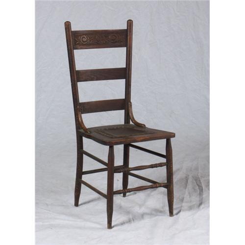 SIDE CHAIR: Circa 1880 oak side chair, ladder back with carved crestrail, leather seat, turned front stretchers.