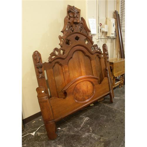 BED: Circa 1880 walnut Neo Renaissance bed, headboard, footboard, rails and slats, carvings, burlwood. 74''h x 56''w x 73''l