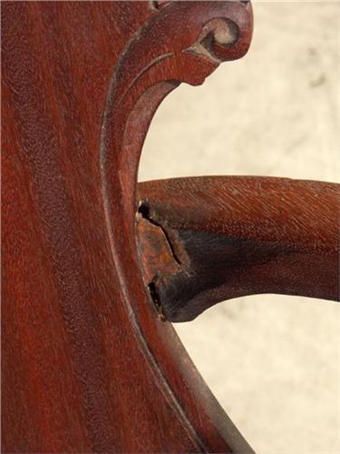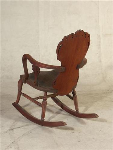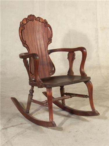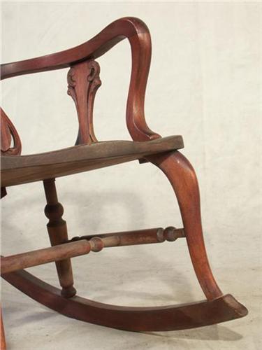 ROCKER: Circa 1890 mahogany rocker, caved back and side panels, cabriole front legs, turned stretcher and back legs.