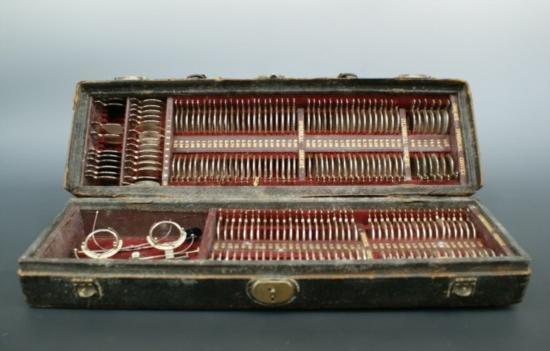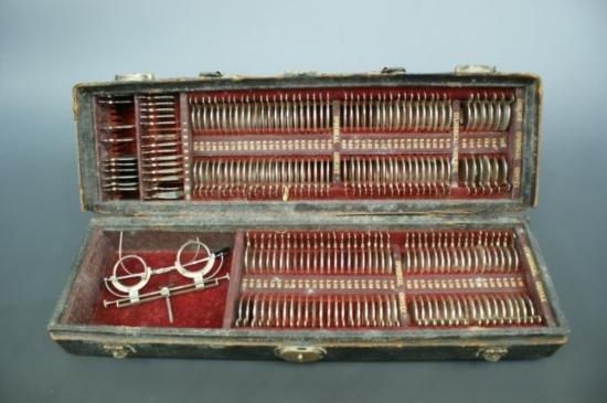 CIRCA 1890S OPTOMETRIST FITTING SET - Fantastic nearly complete set, with fitting specs, pairs of each grade of lens,Each form with its own caption,Spherical Concave Cylindrical Concave, Cylindrical Convex, Spherical Convex. In a leather covered wooden box. Dark red velvet form-fitted interior. Measures 4 x 17 x 5 inches