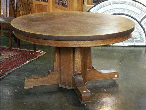 DINING TABLE: Circa 1900 American golden tiger oak round top dining table, molded apron, hexagonal standard with four molded downswept legs on casters. 30''h x 52''diameter.