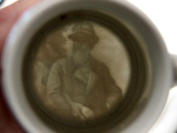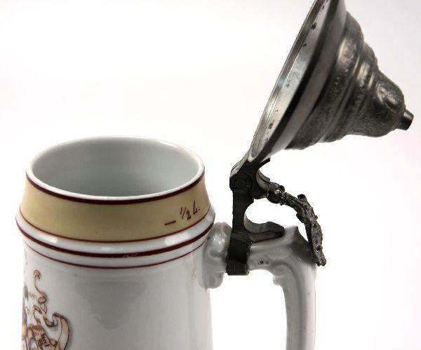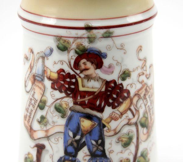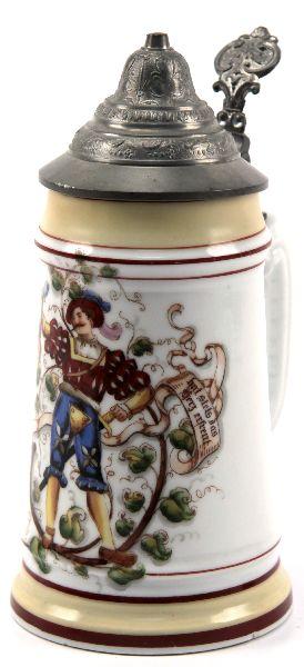 Central figure is a German Landsknecht Freebooter and floral designs. Writing extolling the beer drinking pastime flank the floral designs.