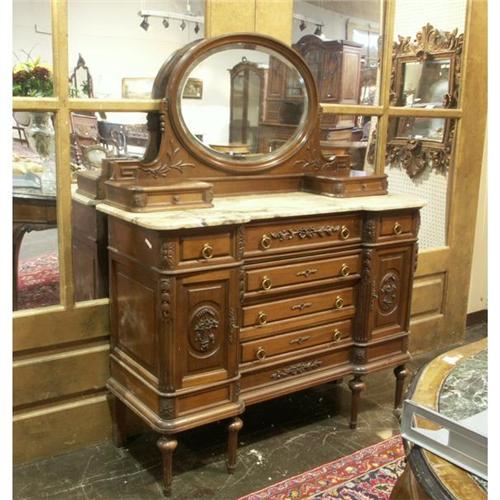 DRESSER: Circa 1900 Italian Baroque carved walnut dresser, marble top. 65''h x 19''d x 52''w
