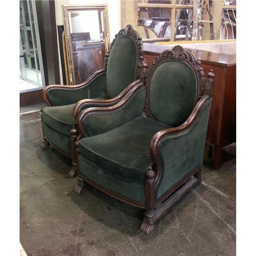 TWO ARMCHAIRS: Circa 1900 Neo Renaissance gentleman's and lady's armchairs, each with carved oval back flanked with carved rosette stiles with finial, downswept arms, paw feet.