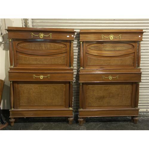 PAIR TWIN BEDS: Circa 1900 pair French Empire style mahogany and birdseye maple twin beds, each with ormolu and beaded trim. Note: does not come with side rails. Each measures 62''h x 40''w.