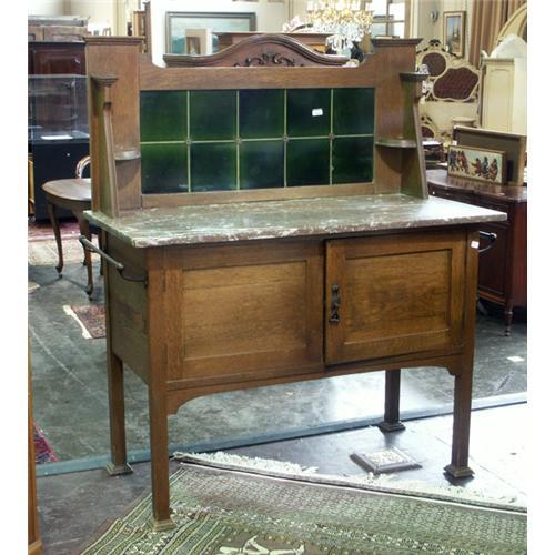 WASHSTAND: Circa 1910 Arts and Crafts oak washstand, green tile back splash, rouge marble top, metal towel bars. 50''h x 20''d x 42''w
