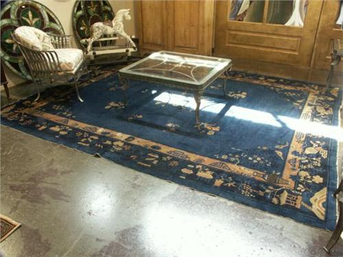 CARPET: Circa 1920-30 Chinese wool carpet measuring approximately 11.4 x 9.0, allover pattern, dark blue field and salmon border, wear spots.