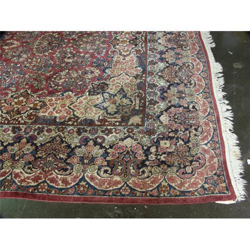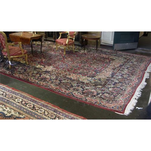 CARPET: Antique circa 1920-30 Persian Sarouk carpet of hand knotted wool woven on a cotton warp measuring approximately 17.9 x 11.3, allover pattern, wine color field and navy border.