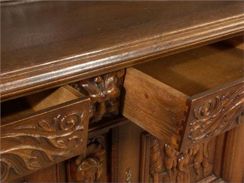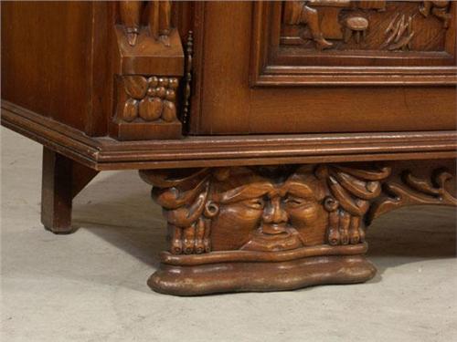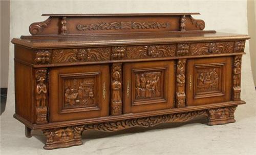 BUFFET: Circa 1930 oak Neo Renaissance buffet, carved with folk figures and other motifs. 46''h x 23''d x 83''w