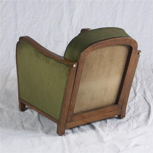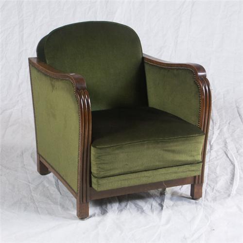 ARMCHAIR: Circa 1930 walnut Art Deco armchair, green upholstery.