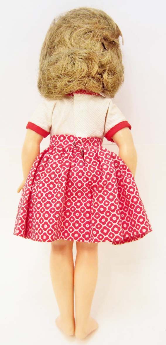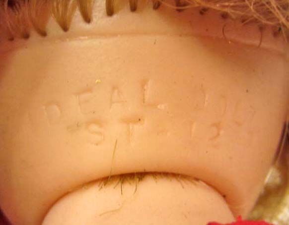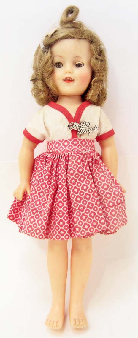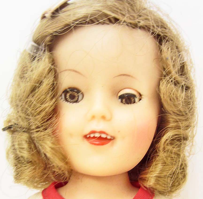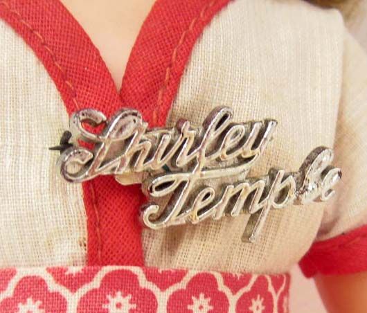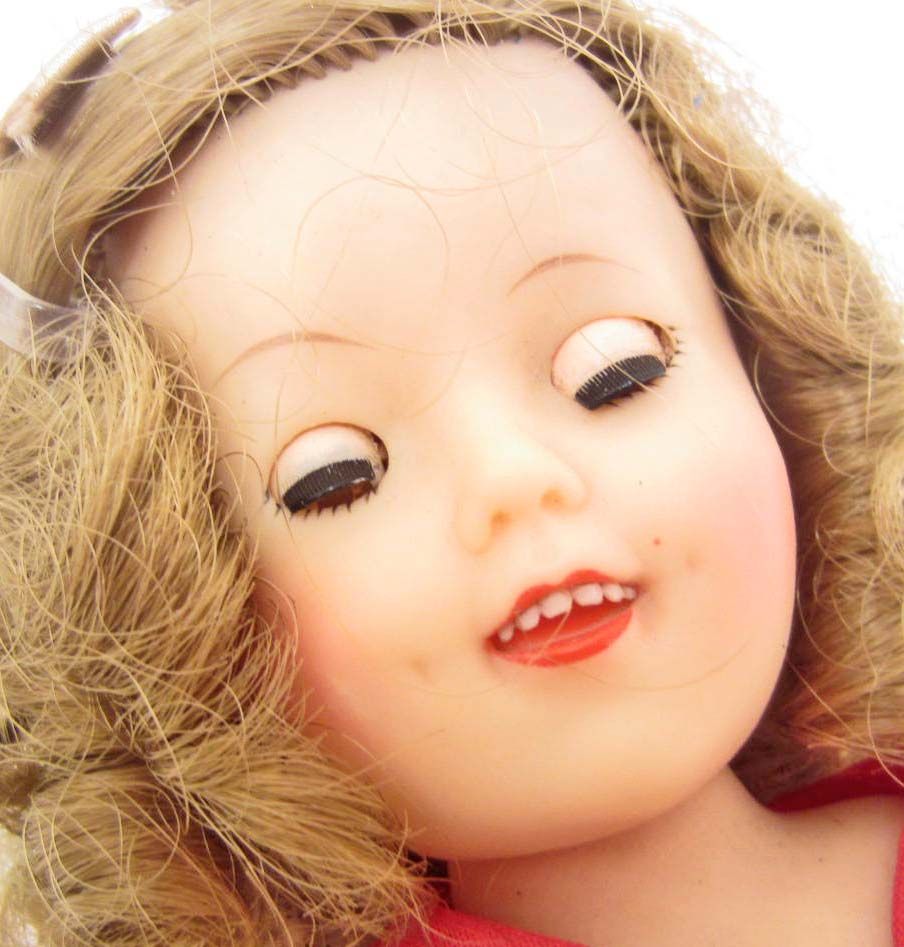 She has sleepy eyes and is showing teeth. She also has a Shirley Temple pin on her dress.