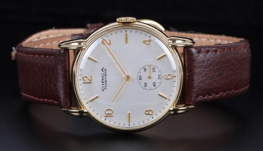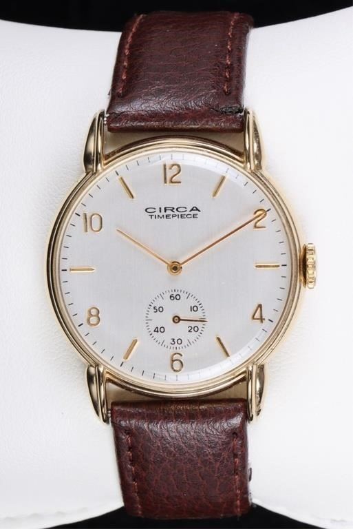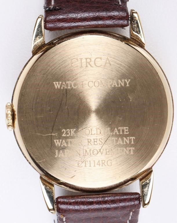 Circa 23K gold plated men's wristwatch with genuine leather band.